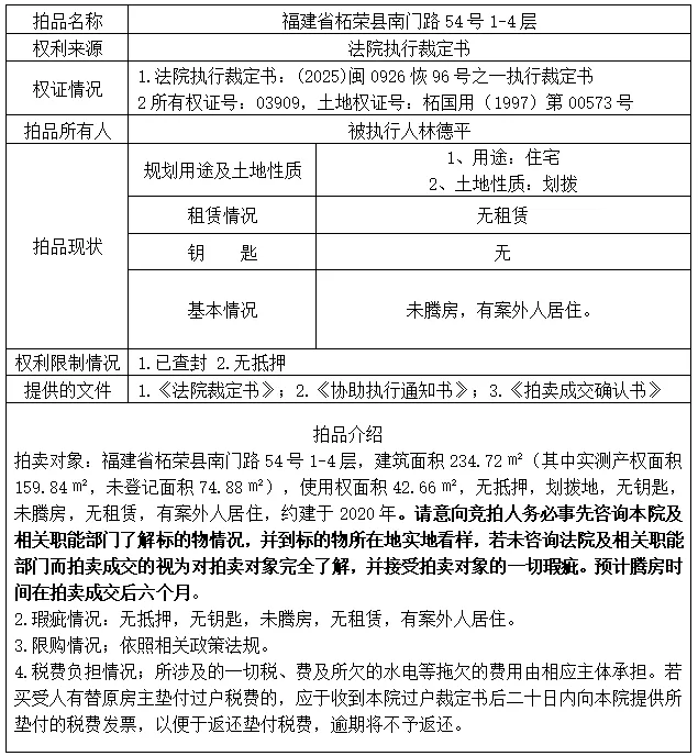 更多资讯请移步淘宝网司法拍卖平台:https://sf.taobao.com/0593/10?spm=a213w.3065169.courtList.269.103f1319jepINp