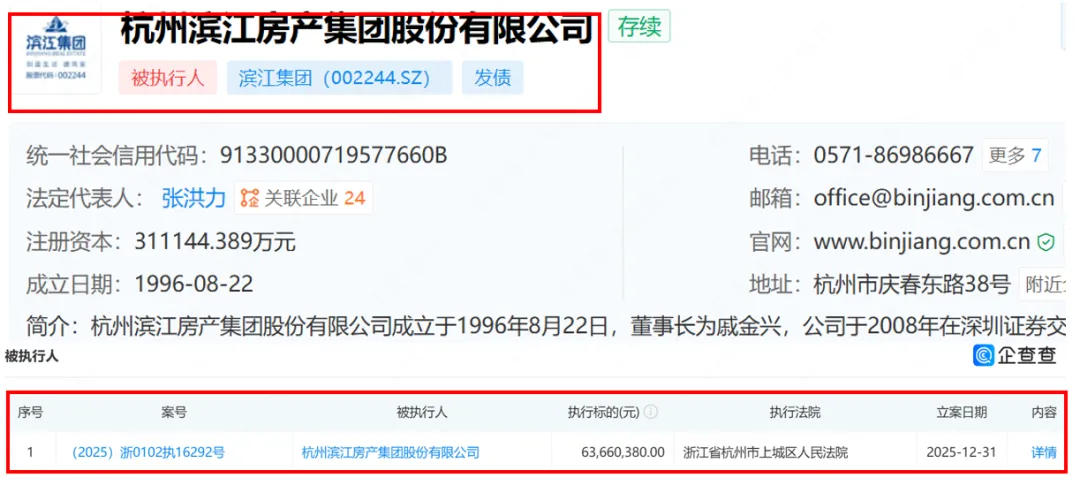 2025年12月31日,杭州滨江房地产集团成为被执行人,涉案金额6366.04万元,执行法院是杭州市上城区人民法院。