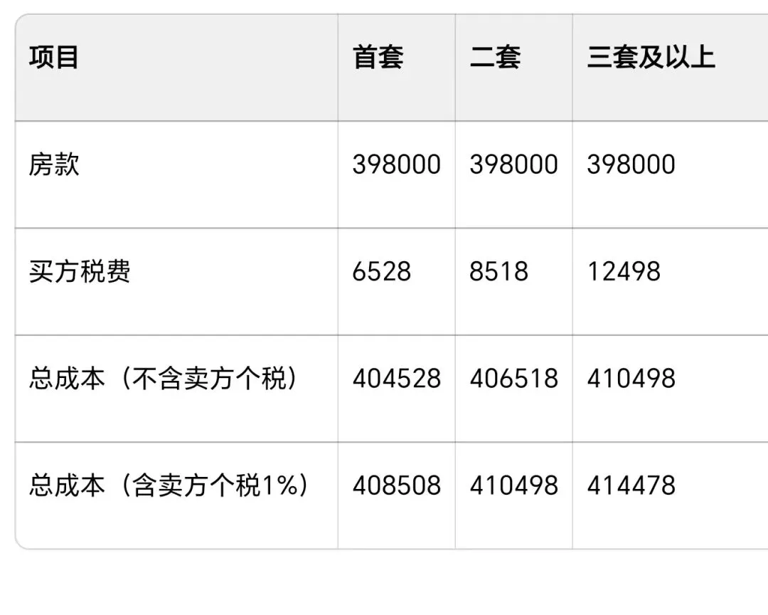 四、总购置成本(含房款+买方税费,不含卖方个税/中介费/贷款费)