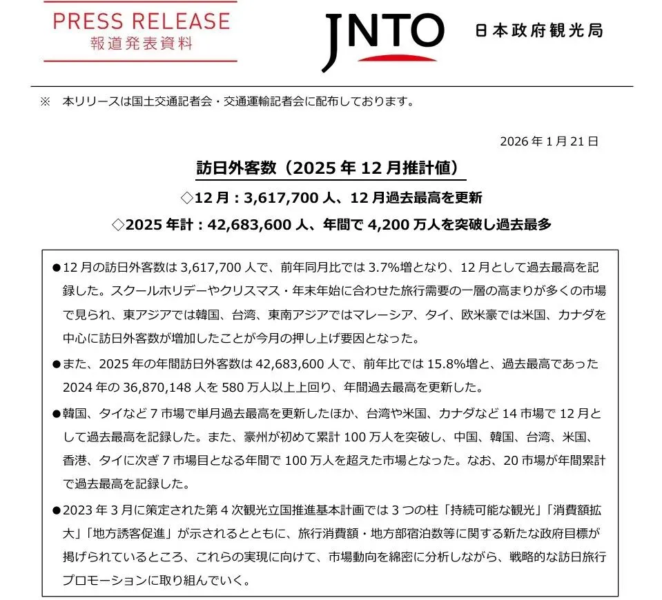 日本观光厅刚出的数据很有意思:2025年访日游客总数 4268万+,创历史新高。