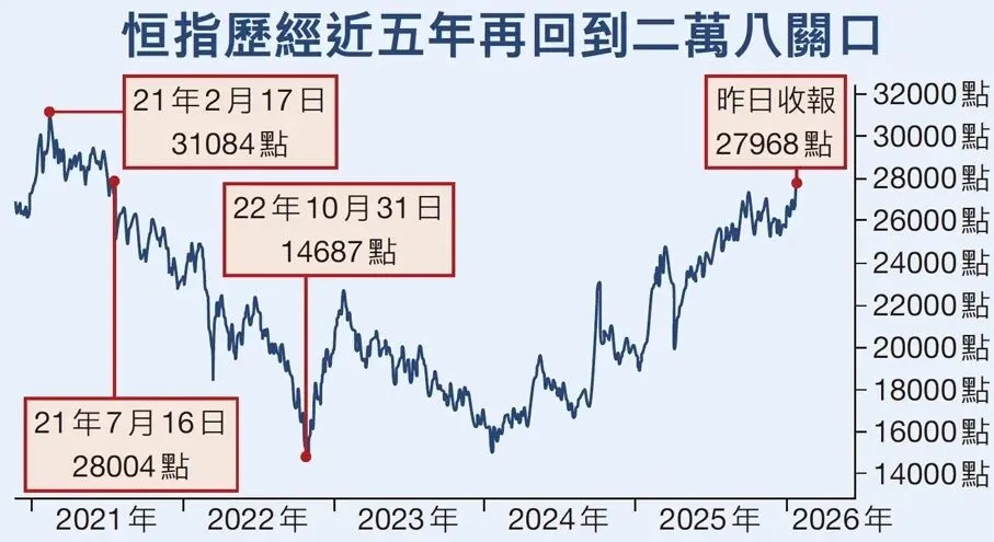 2.恒指昨日一度升穿28,000點大關,是2021年7月中以來首次,最終收報27,968點,升0.51%。