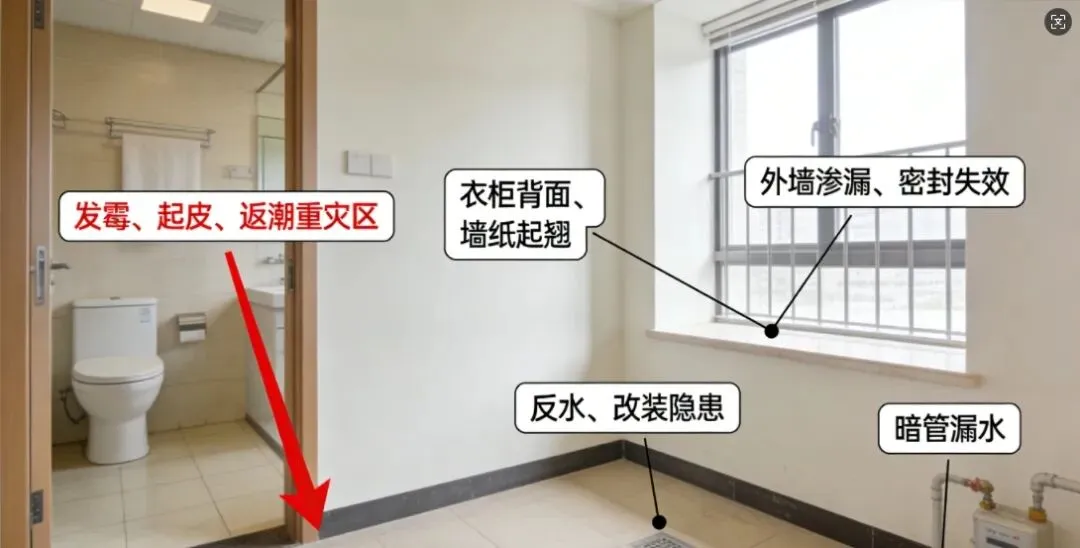 卧室与卫生间共用的那面墙: 看看衣柜背面(如果能看到)或者墙纸有没有起翘。