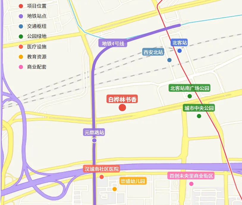 项目南门距离地铁4号线元朔路站仅约300米,步行5分钟即可到达。通过4号线,1站直达西安北站,可无缝换乘2号线和14号线。