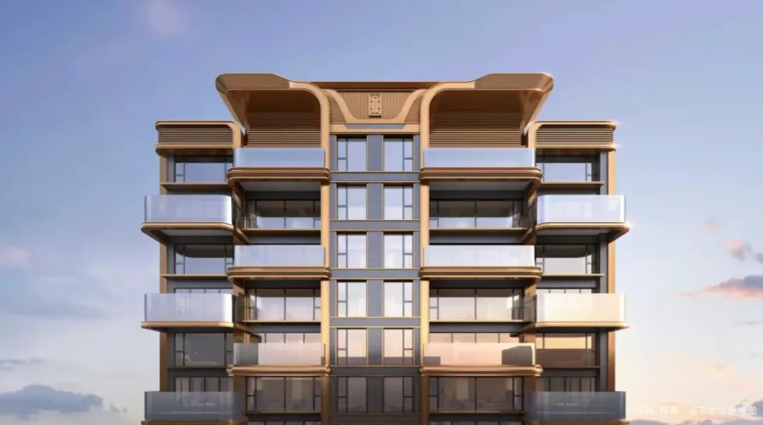 在西安市场,多数项目外立面采用真石漆,即便部分高端项目也仅在南立面使用铝板。而邦泰·观宸曲江则实现全系南北立面干挂石材到顶,大面积蓝棕石材通铺搭配定制曲面铝板,并以金冠宝顶收束顶部,打造具有地标感的建筑形象。