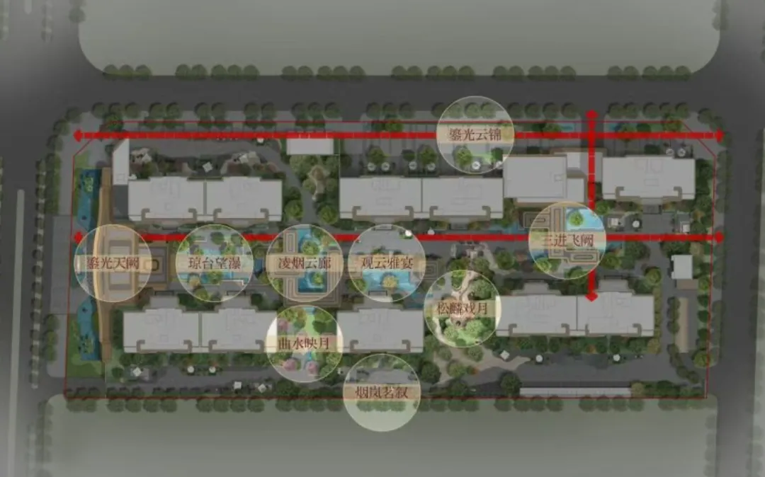 社区以盛唐美学为灵感,将“庭、晖、涧、廊、宴、阙、山、影”等传统空间意象融入现代景观体系。整体规划采用“一核两轴九境”结构,重现曲水流觞的东方雅韵。