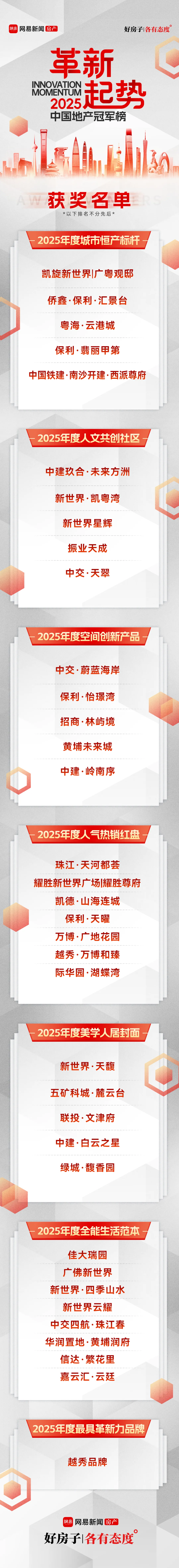 在这样的行业背景下,网易新闻房产延续15年观察沉淀,以“革新起势”为主题,重磅推出【2025网易房产·中国地产冠军榜】。