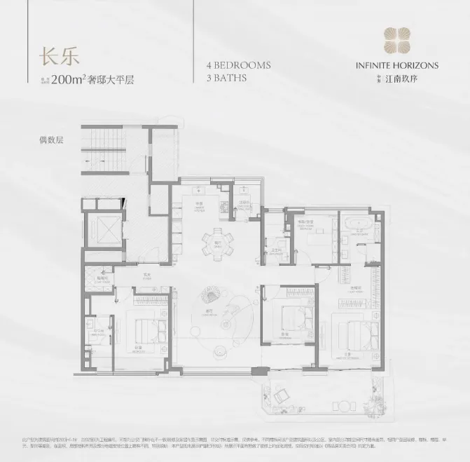 200㎡的偶数层户型,露台连接主次卧,直通客厅。