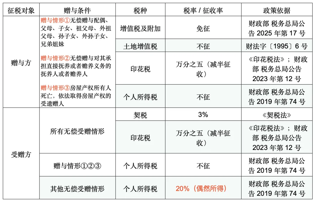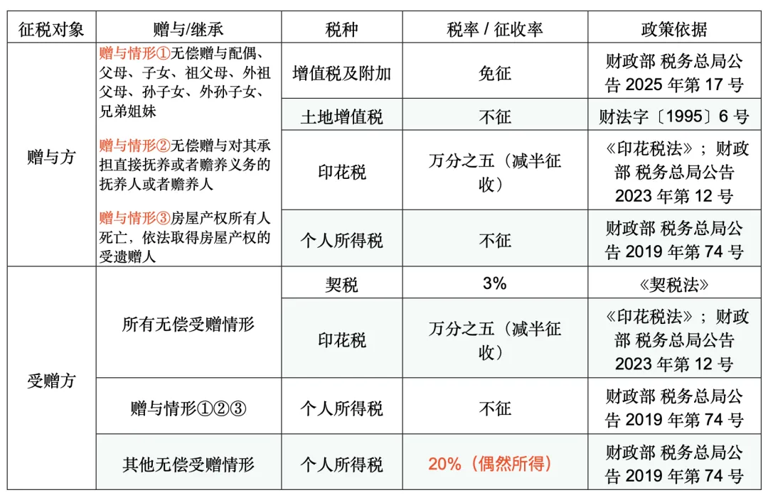注:其他无偿受赠的情形下,个人所得税应纳税所得额为赠与合同标明的房屋价值减除受赠人支付的相关税费,受赠环节不扣除房屋原值,但受赠人后续转让房屋时可扣除原赠与人取得房屋的实际购置成本。