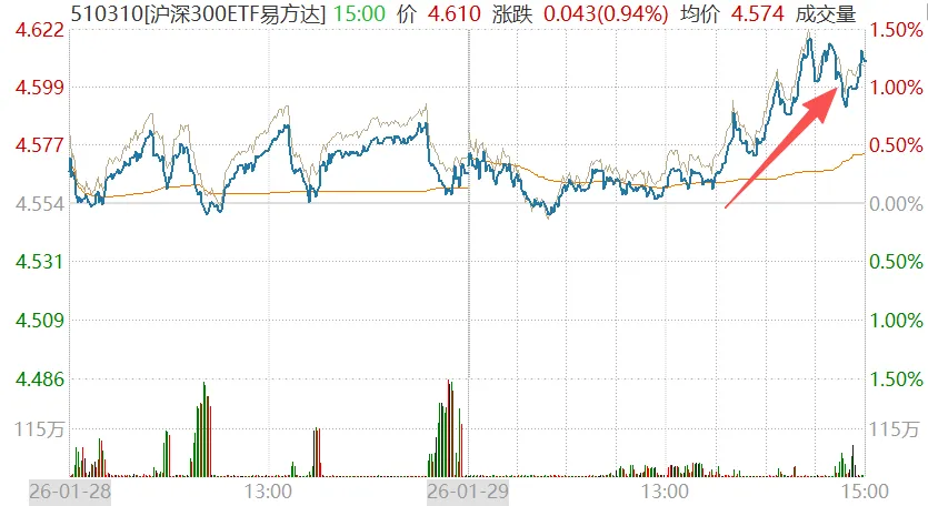 下午一波强势拉升,沪深300ETF易方达(510310)一度涨了1.5%,但没出现放量砸盘。这是好现象,不知道是不是预示着“大哥”的砸盘暂告一段落。