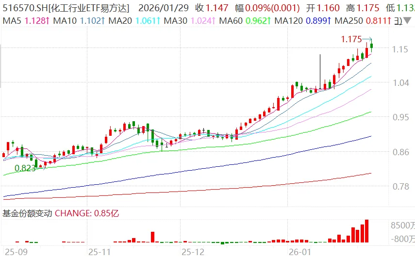 化工行业ETF,盘中再创新高,收盘也是红盘。看资金的话,最近持续流入,且有加速迹象,资金还是很看好化工。
