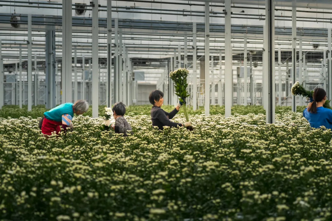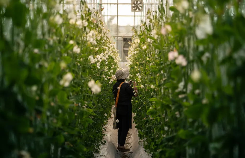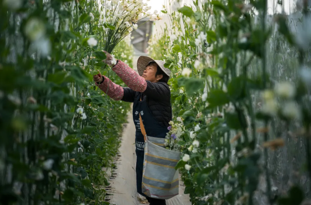 另一边,在位于庙镇的兰桂骐农业科技崇明基地,记者还没进入香豌豆种植大棚,先闻到一阵馥郁的香气。棚内翠绿的香豌豆花藤顺着特制网架攀爬生长,藤上缀满精致可爱的白色花朵,工人正忙着采收。