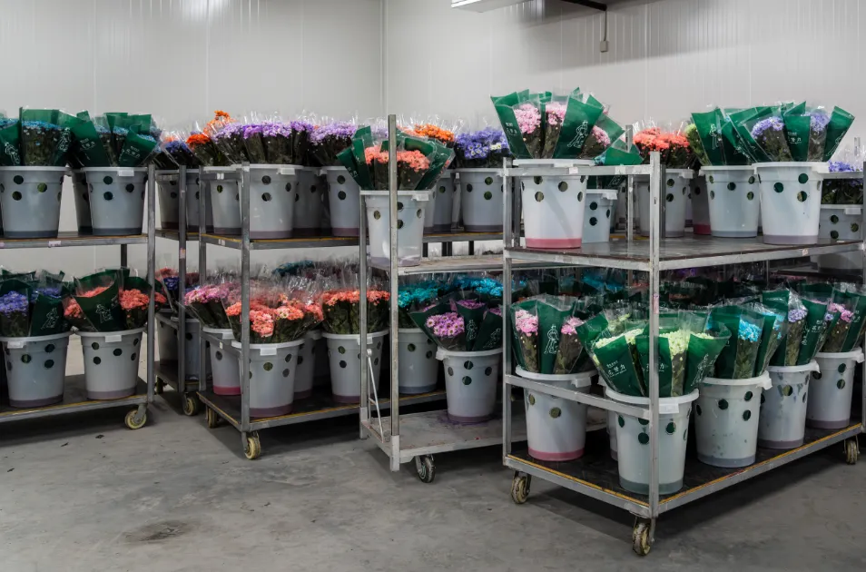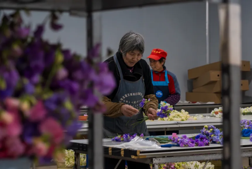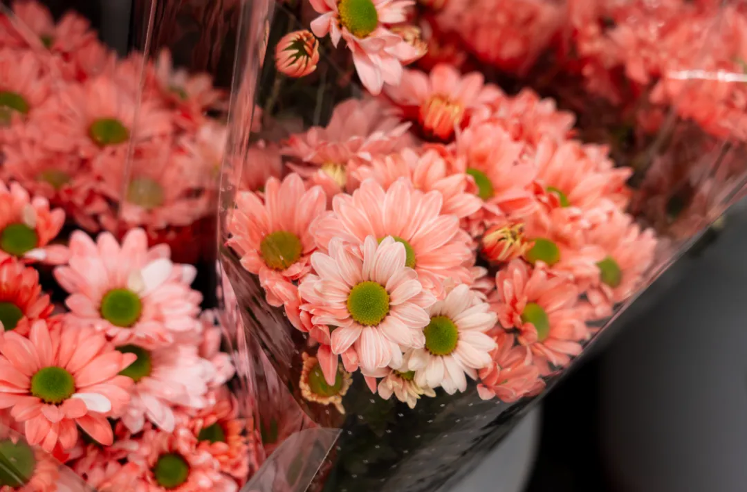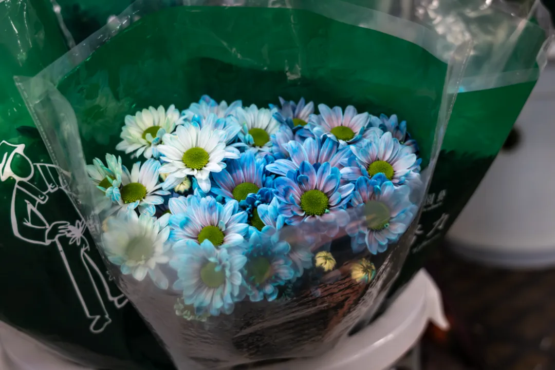 基地负责人周雪介绍,他们每天采收鲜切花3到5万支左右,这些白色雏菊被运至打包车间进行自动化捆扎、人工包装后进入吸色工序,即将白色雏菊花茎浸泡在生物色素中,通过花朵自身的吸水作用,将色素吸至花瓣,染制成各种色彩。