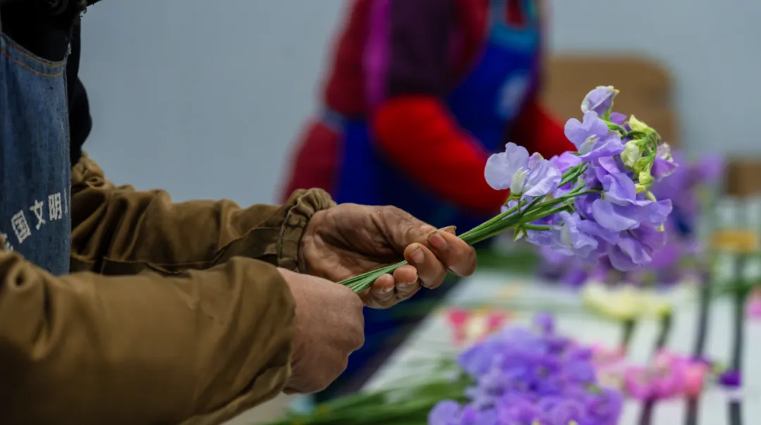 基地负责人雷利锋告诉记者,这段时间基地每天香豌豆的销量约有一万支左右。采摘好的香豌豆花由人工裁剪、捆扎,根据花色、花朵数量、花茎长度分级打包运送至多个销售平台、鲜花市场,市民在叮咚买菜、盒马等平台均可购买。