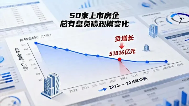 行业风险正加速出清并已接近尾声。50家上市房企的总有息负债规模自2022年之后逐年减少,2023年之后更是负增长,2025年中期降至51816亿元。
