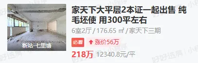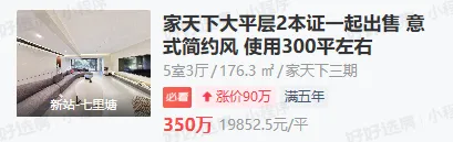 家天下一套176平房源,总价直涨90万,目前单价直逼2万/平。