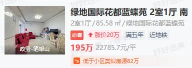 绿地国际花都一套85平米户型,总价涨了20万,目前单价2.2万/平。
