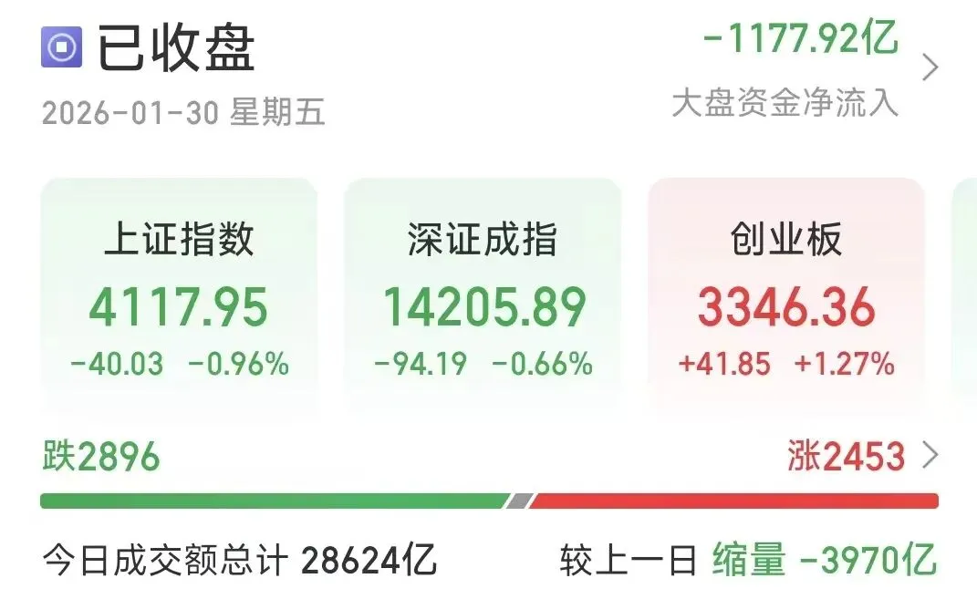 指数层面:沪指跌0.96%,报4117.95点;深成指跌0.66%;创业板指涨1.27%,表现相对抗跌。沪深两市成交额约2.86万亿元,较前一交易日缩量约3900多亿。