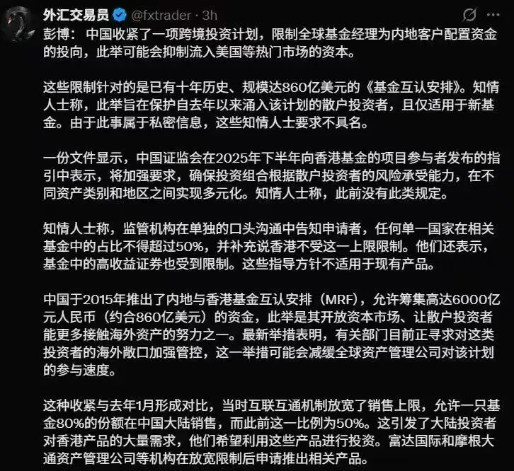 2 . 彭博:中国收紧了一项跨境投资计划,限制全球基金经理为内地客户配置资金的投向,此举可能会抑制流入美国等热门市场的资本。