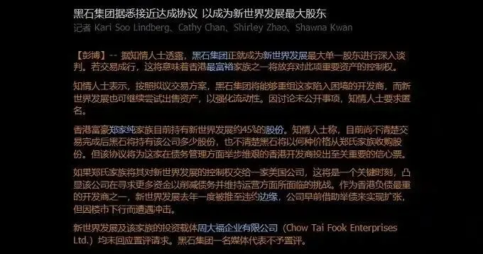 3 . 彭博:黑石集团据悉接近达成协议,以成为新世界发展最大股东。