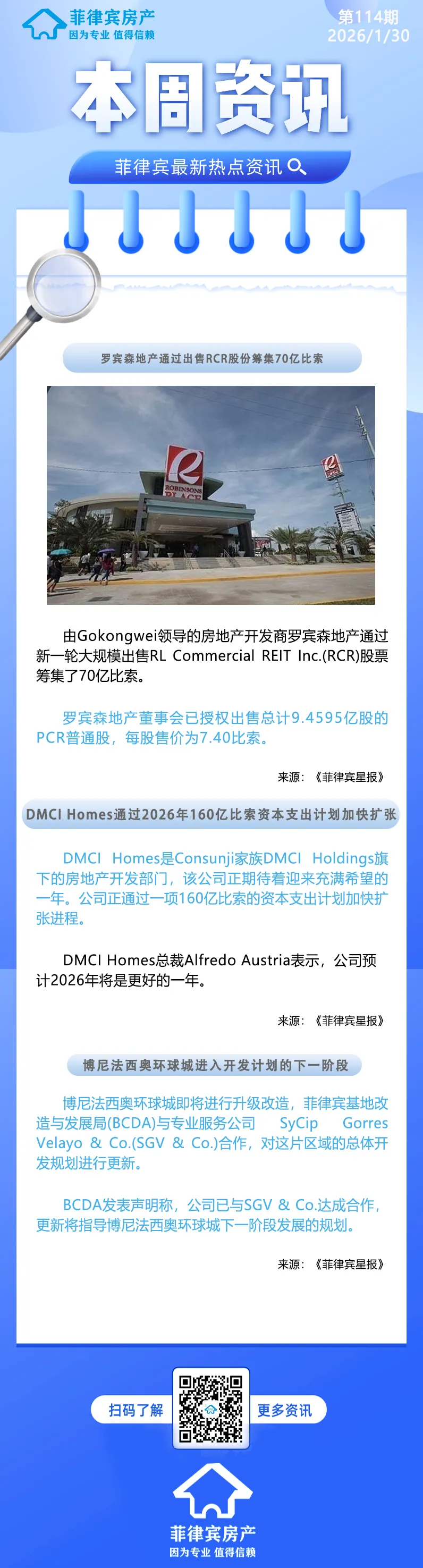 >本周资讯:罗宾森地产通过出售RCR股份筹集70亿比索