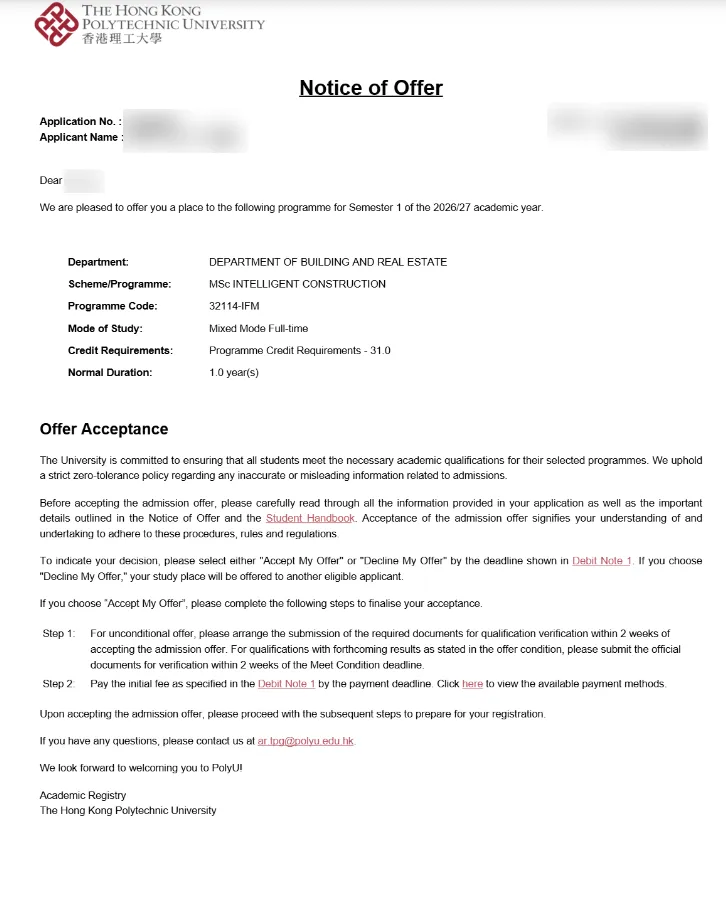 申请过程倒没想象中复杂。雅思总分刚好6.0,听力6.5写作6.5是我强项,阅读和口语确实拉胯,阅读5.0口语5.0,考前练了不少真题也没太大起色,想着反正港理工往年也有收6.0的,就硬着头皮提交了。文书里没写啥漂亮话,就说清楚三点:本科学了土木但缺数字化知识,工作三年知道行业要变天,想通过这个硕士补上短板,以后回国继续做智能建造相关的事。推荐信找了本科教结构力学的教授和现在的直属领导,教授说我基础扎实,领导夸我现场应变能力强。没想到提交后一个月就收到面试通知,面试官是个戴眼镜的老师,问我对智能建筑的理解,我就举了个例子,上次项目里想用无人机巡检外墙,结果因为不懂数据处理白折腾了,这就是我想学的。