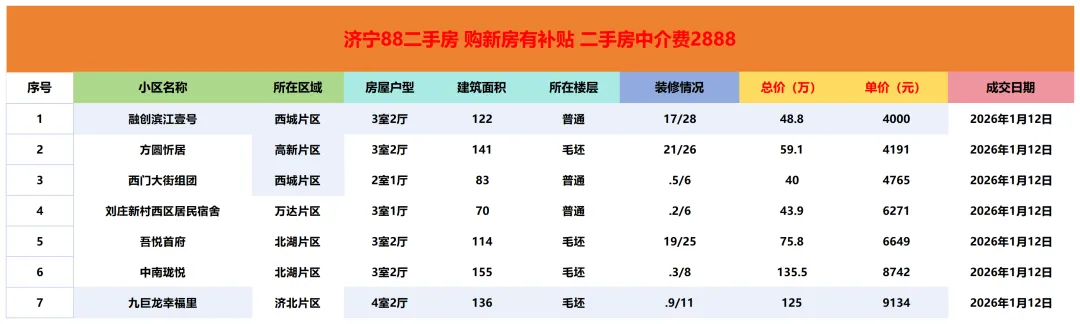 济宁二手房成交市场价参考|1月12日