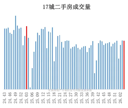 首先看全国 17 个重点城市的二手房网签量(周度数据):