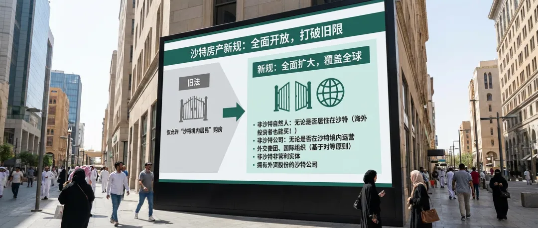 近日,沙特阿拉伯房地产总局(REGA)正式发布《非沙特人房地产所有权法(更新版)》官方概述。这一重磅立法改革,核心是进一步开放沙特房地产市场、吸引外国直接投资(FDI),为沙特“2030愿景”下的经济多元化注入强劲动力。对于全球投资者,尤其是中国投资者和穆斯林群体来说,这无疑是一次极具价值的市场机遇。下面,我们用通俗的语言,为大家拆解这份新规的核心要点!一、核心变化+生效时间,先划重点!