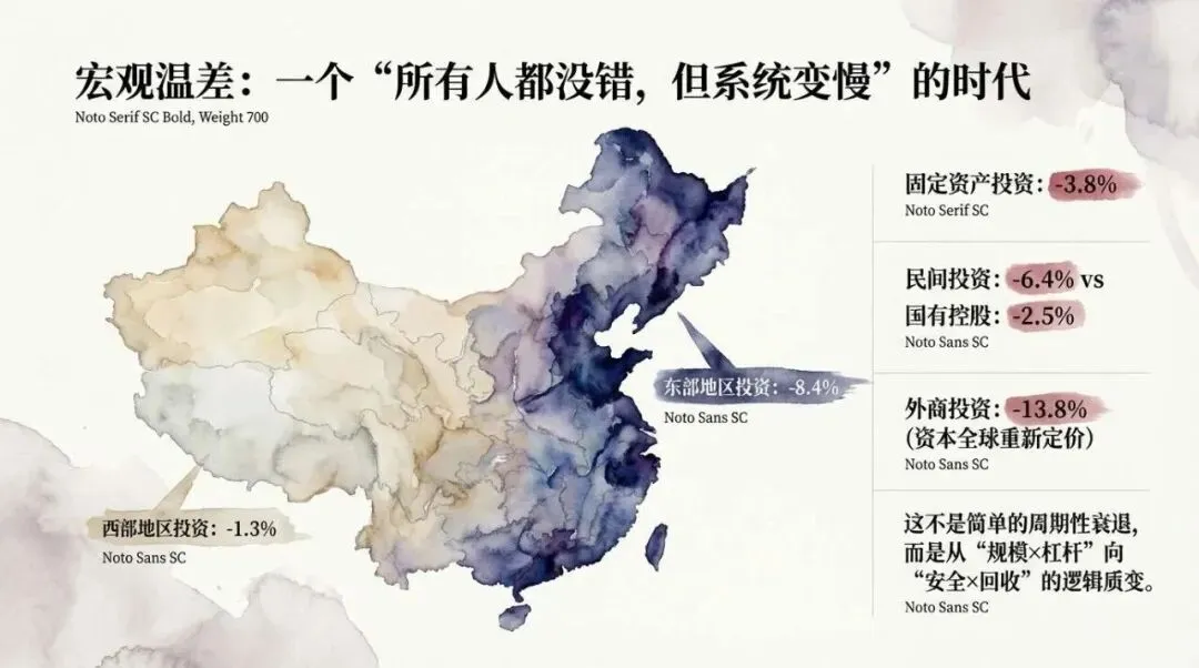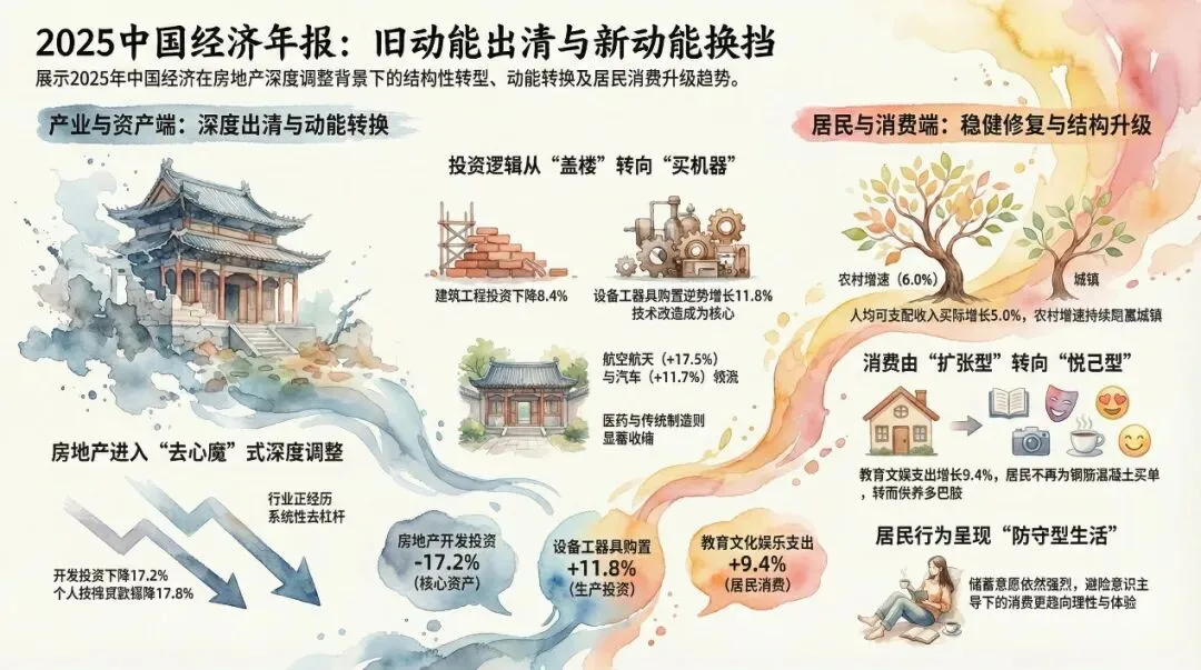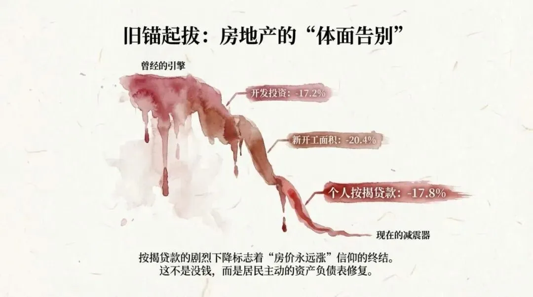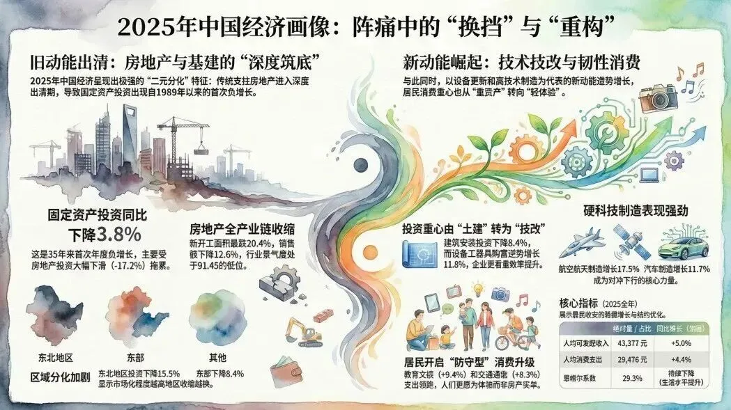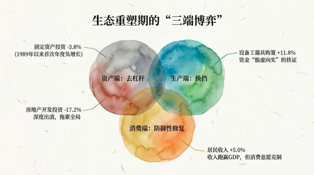 这是新质生产力对旧动能的无情碾压。房地产这块海绵吸了太多的水,必须挤干;而实体制造业这棵树苗缺水太久,必须漫灌。哪怕牺牲短期的GDP增速(投资下降3.8%),也要完成这次换血。这是一场刮骨疗毒,痛是必然的,但只有这样,经济才能从虚胖的巨人,变成满身肌肉的战士。