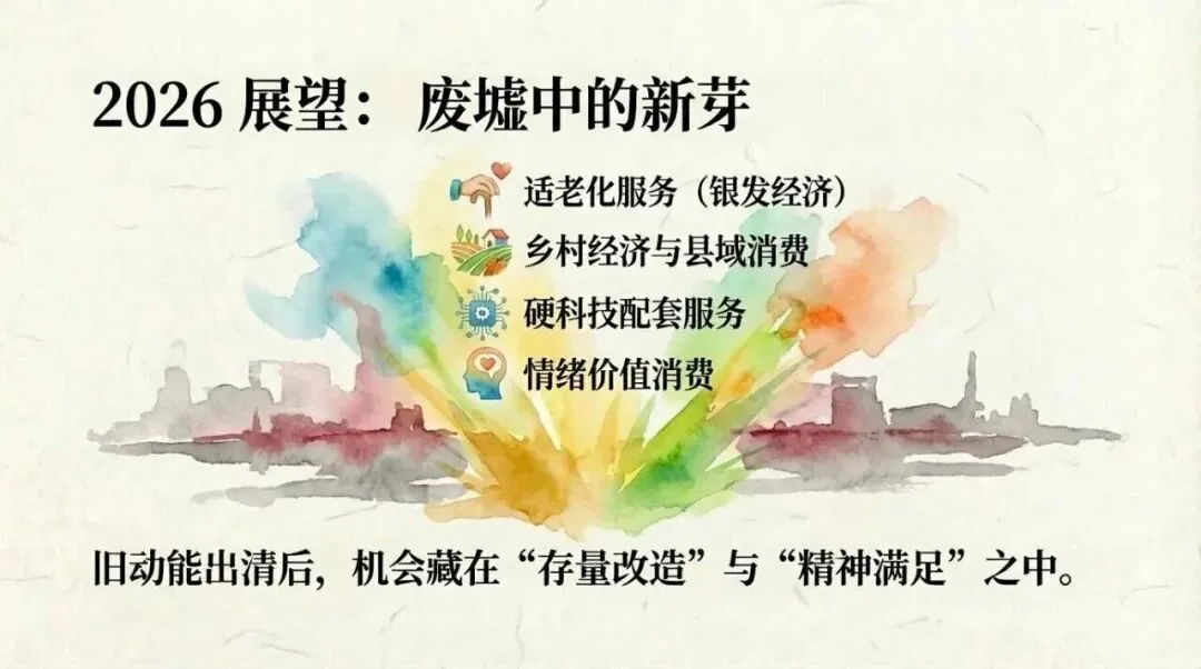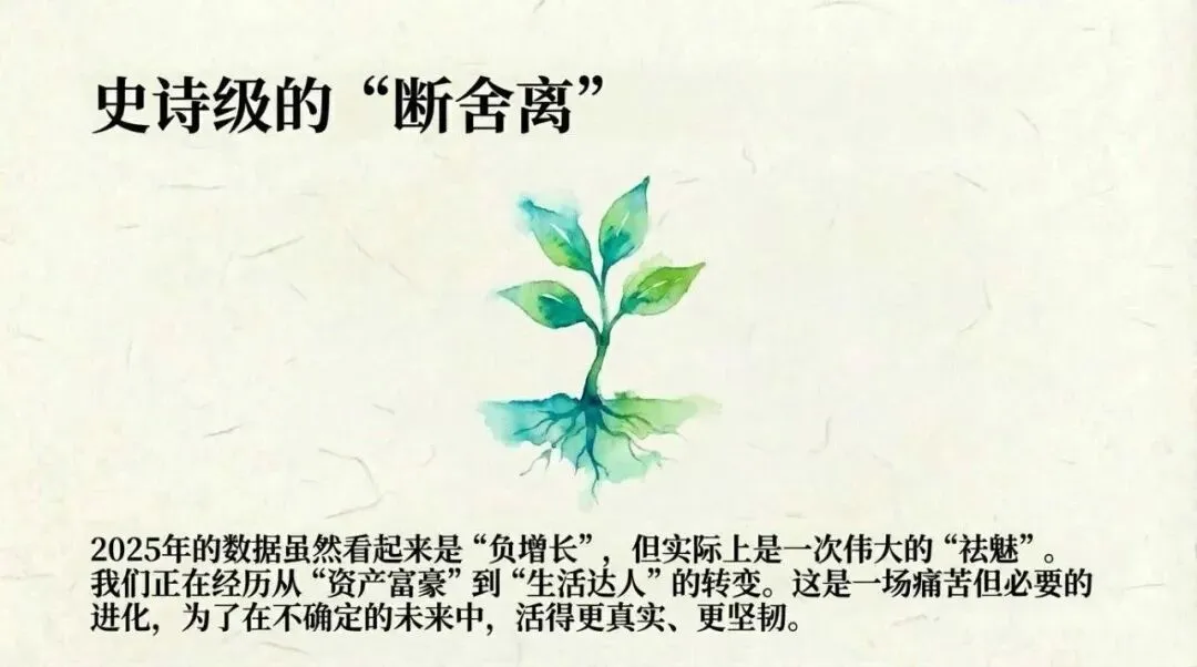 这就是2026年的魔幻现实:我们正在经历一场“脱虚向实”。只不过,这个“实”对于国家是硬科技,对于个人是“活在当下”。我们正在经历一场长达三十年的“地产崇拜”的烂尾,以一种全新生存哲学的废墟重生。