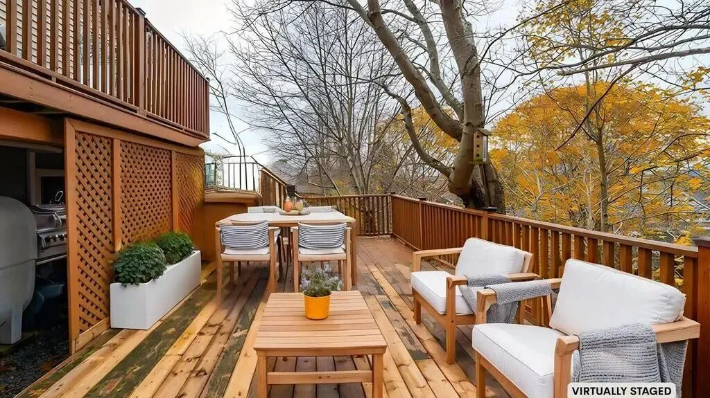 室外是双层露台,易于打理的后院,并且院子里配有大型储物棚提供额外的储物空间。