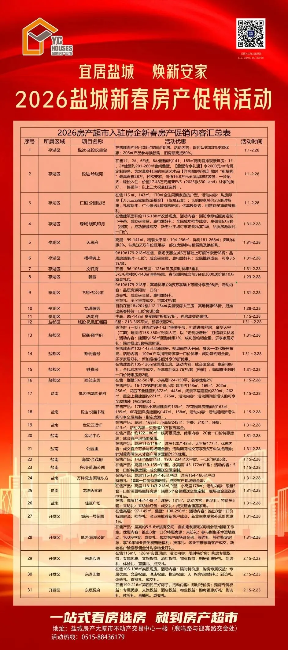 为满足新春置业需求,促进市场供需对接,2026盐城新春房产促销活动1月31日火热开启,活动将持续到3月3日(元宵节)。