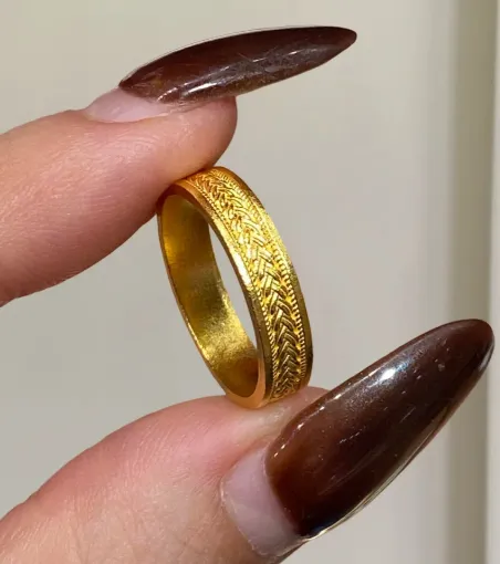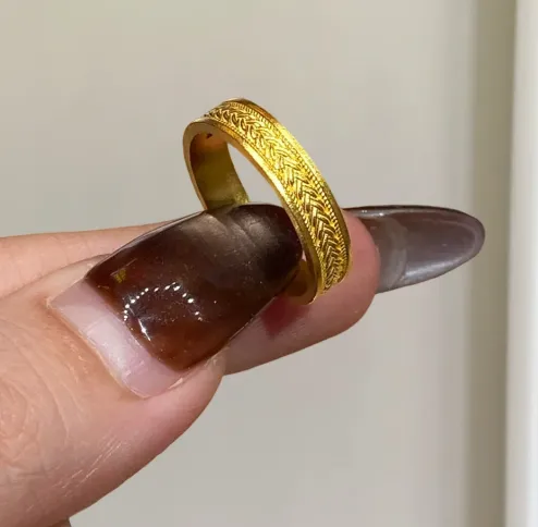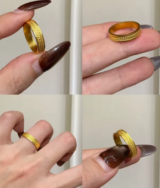 手上我更讲究松弛感 手链一细一宽 走路手会摆来摆去 光泽会跟着动 有时候键盘敲久了 也不会咯得难受 戒指我会选一圈细戒叠着戴 中指无名指各一枚 足金的那枚光感更软糯 然后18K金那枚边缘更利落 两个放一起会很有对比 朋友都问哪买的 其实渠道挺普通的 我看的是做工 我会看焊点有没有突兀 重量我称过 大概2 3克左右日常完全ok