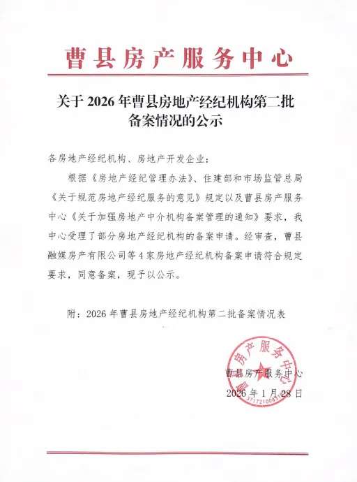 >关于2026年曹县房地产经纪机构第二批备案情况的公示!