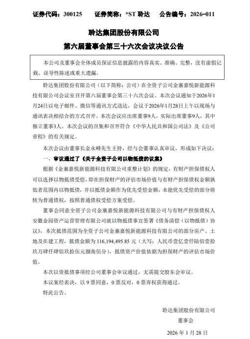 1月28日,*ST聆达(300125)发布第六届董事会第三十六次会议决议公告。