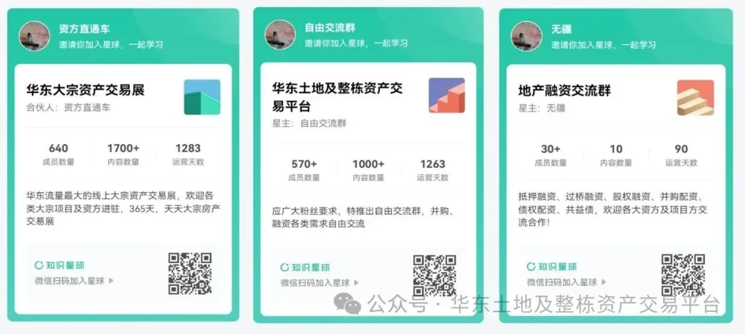 知识星球~华东大宗资产交易展,新年特惠年费仅2千元,900个华东大宗资产项目,线上最大业务流量,365天天天大宗房展会,欢迎各大业主、资方及渠道方加入。金卡会员赠送1次公众号3条位置广告。知识星球~华东土地及整栋资产交易平台--自由交流群,年费100元(前600名会员),粉丝自由交流。知识星球~地产融资交流群,年费60元(前50名会员),抵押融资、过桥贷款、股权融资、并购配资、债权配资、共益债等等,融资业务对接交流。