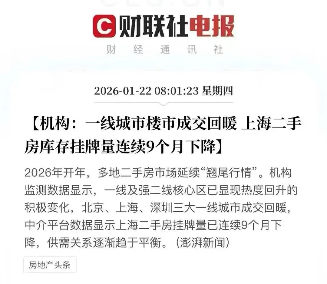 据财联社官媒报道,上海二手房挂牌量已连续9个月下降,供需关系逐渐趋于平衡。