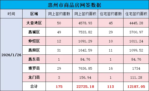 大亚湾区网签50套,面积4578.93㎡;惠城区49套,7533.82㎡;仲恺区12套,1091.29㎡;惠阳区31套,1642.59㎡;惠东县1套,84.76㎡;博罗县29套,7636.85㎡;龙门县3套,156.94㎡。合计175套,22725.18㎡。