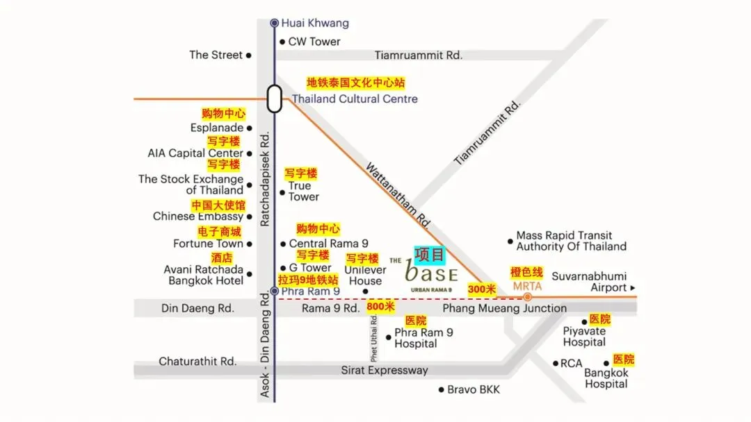 项目位置紧邻Rama 9路,真正双轨交汇距离地铁蓝色线Rama 9站800米,距离在建橙色地铁(预计2028年通车)仅300米,蓝色线一站换乘机场快线Makkasan总站! 自驾650米三分钟即可上高速完美避开Rama9十字路口 堵车点、25分钟到素万那普国际机场不论是自驾或者公共交通出行都极为便捷。