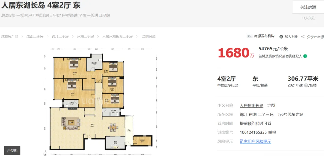 2026年01月28日,据市场端消息:成都锦江东湖,人居东湖长岛建面307平套四报价1680万;目前房东心里价在1680万愿意出售。
