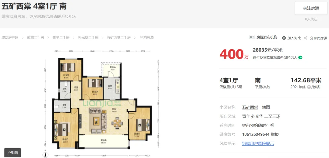2026年01月28日,据市场端消息:成都青羊外光华,五矿西棠建面143平套四报价400万;目前房东心里价在400万愿意出售。
