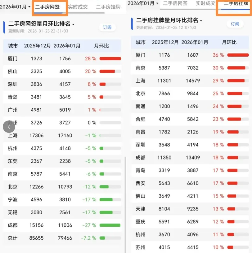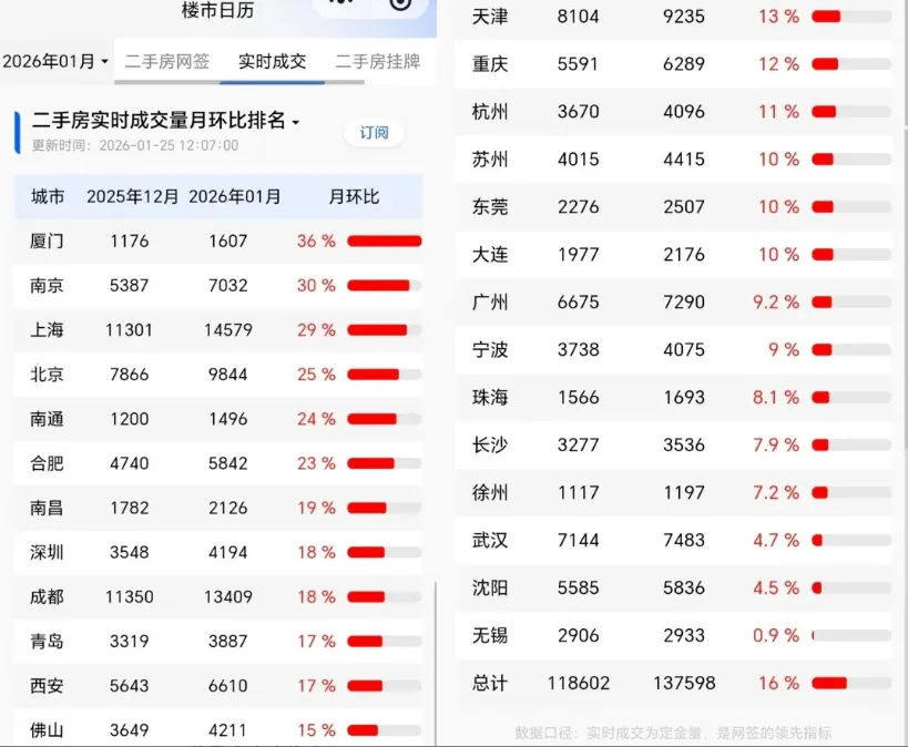 春节前二手房反常回暖?核心城市“小阳春”提前,专家:别盲目抄底!离马年春节只剩20天,全国26城二手房定金量却连续大涨,厦门、上海等城市领涨,和往年节前“遇冷”截然不同。这波行情是真回暖还是短期躁动?核心城市成交数据如何?2026年楼市会怎么走?离马年春节还有20天,本该是二手房市场“歇业”的节点,却杀出了一匹“黑马”,冰山指数“楼市日历”显示,1月以来全国26城二手房实时成交量(定金量) 连续多日全面大涨,环比涨幅在14%-21%之间,厦门、上海、南京等城市涨得最猛。要知道,往年这个时候,二手房成交早该“降温”了:2025年春节在1月底,2024年12月和2025年1月定金量环比分别降14%、42%;2024年春节在2月中,2024年1月、2月分别降15%、48%……今年这波“反季节”上涨,确实反常。更有意思的是,成交涨了,挂牌量却跌了,2026年1月全国26城二手房挂牌量环比降1.8%,少了超5万套。成交涨得猛的城市,挂牌房源跌得更明显。简单说就是:想买的人多了,想卖的人却“惜售”了,都想等春节后再挂。定金量是网签的“先行指标”(一般提前两周到一个月),比网签更能快速反映市场情绪。这波定金量大涨,说明二手楼市的“小阳春”可能提前了,但别高兴太早,冰山指数负责人提醒,这只是“买家的小阳春”,卖家惜售导致房源减少,而且2026年市场估计还会回撤,没特别政策的话,再跌10%才到“底”。冰山指数机构负责人:“定金量数据说明二手楼市的‘小阳春’提前了,但楼市不会一直小阳春。并且这是买家的小阳春,卖家大部分还是想春节后挂牌、惜售心理也在增强,所以房源挂牌量环比大幅下跌。2026年市场估计会继续回撤,如果没有特别政策出台,再下行10%会基本到底部。但止跌不等于牛市,大家也别想着抄底,真等到救市就不一定是‘底’了。”虽然有人觉得“没感受到回暖”,但核心城市中介的数据却很实在,和冰山指数的方向基本一致。贝壳找房数据显示,厦门1月1日-20日二手住宅成交1303套,日均约65套,带看量环比涨8.2%。简单说就是:看房的人多了,而且以前要犹豫一两个月的买家,现在“拍板”更快了,观望情绪弱了。上海1月前20天网签量突破1.4万套,环比涨15%。更关键的是,2025年上海二手房月均成交2万套以上(全年25.4万套),比2024年涨17.6%;而挂牌量从2025年5月的23.5万套,一路跌到现在的8.9万套,房源少了近六成,部分房源价格已经不跌了。南京1月以来成交逐周涨,1月5日-11日成交1053套,12日-18日直接涨到1715套(涨了63%),1月11日单日成交309套,是2025年1月以来的最高纪录。乐有家数据显示,深圳1月1日-18日二手房看房量同比涨31.8%,录得量连续多周稳定在1600套以上,香蜜湖、深圳湾等核心片区成交明显上升。北京这边,虽然1月网签量(截至21日9148套)比去年12月的1.72万套少,但业主“低价甩卖”的心态弱了,尤其是核心学区、好地段的房源,以前能砍10万的,现在可能只能砍5万,甚至有人抢房。有链家中介说,有些房子已经折价5-6成,价格基本到底了,波动不会大。为什么春节前会突然暖起来?2026年还能买吗?几位专家的解读很实在,都是大白话。中国城市发展研究院投资部副主任袁帅:“往年此时市场通常因返乡潮降温,但今年春节前夕全国主要城市二手房交易呈现‘反常上涨’态势,除了过年时间晚,前期宽松政策效应逐步显现、‘就地过年’趋势都可能改变了传统周期。2026年二手房市场将呈现显著的‘城市分化’,一线城市与强二线城市企稳复苏,普通二线及以下城市跟涨动力不足。”苏商银行特约研究员付一夫:“2025年下半年以来,核心城市在限购、首付、房贷利率等方面出了不少利好,政策效应在2026年初集中显现,释放了压抑的刚需和改善需求。本质上这是政策刺激下,市场深度调整后的一次情绪释放。但市场已告别普涨暴跌,进入‘精细分化’阶段——好不好卖、涨不涨价,看房源本身(地段、品质、学区)和本地供需。”买家要“重质轻价”:别贪便宜买垃圾房源,优先选核心地段、好品质、带学区的,别盲目追涨;