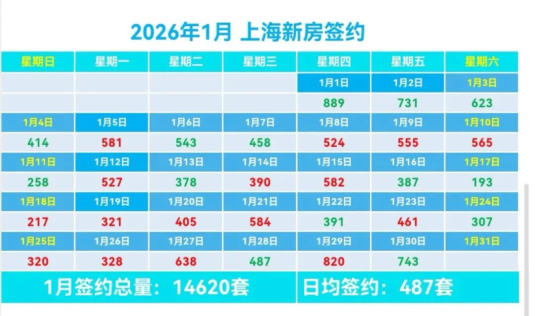 🏠1月上海新房总签约14620套,日均签约487套,本月签约总面积104.98万m²,套均面积73.76m²。