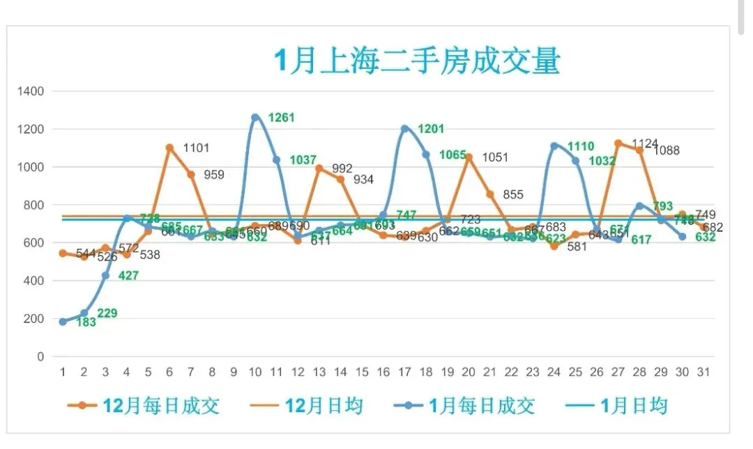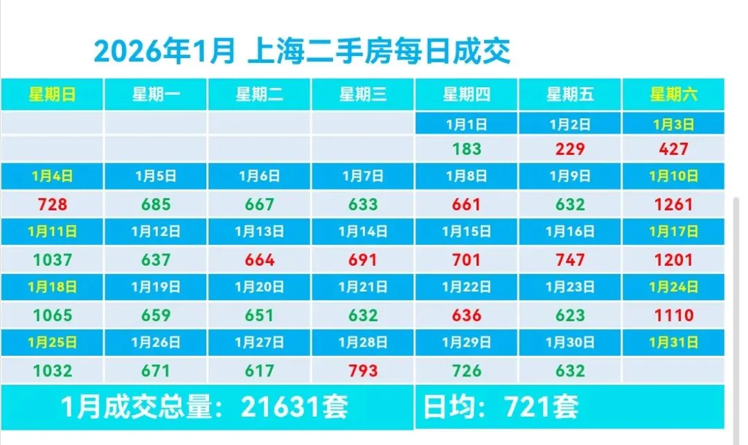 🏡1月,上海二手房成交量累计21631套,日均成交721套,较上个月日均减少19套(降幅2.57%)。