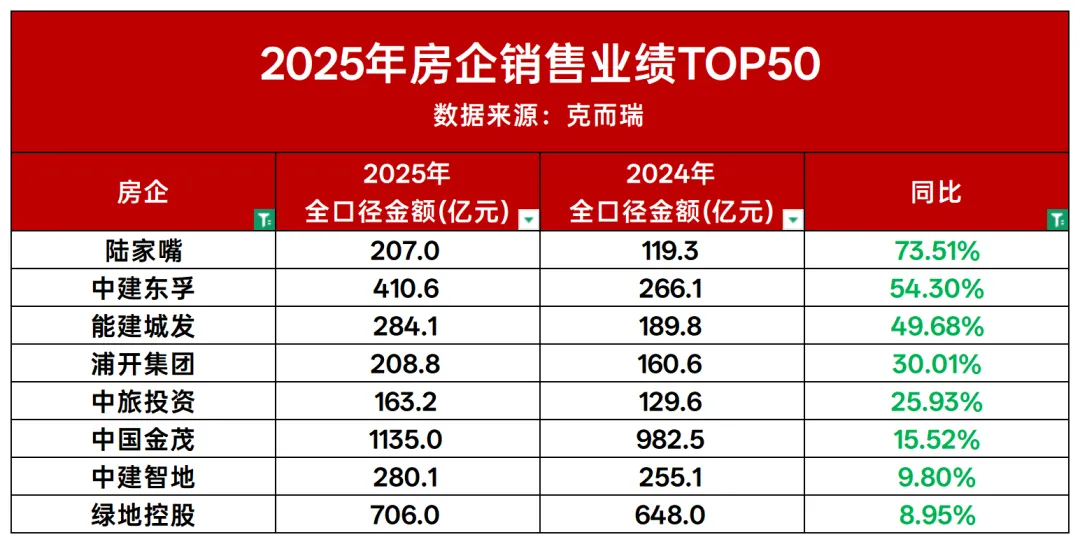 嘉里建设与江山万里置业则是2025年TOP50榜单中的新面孔,据克而瑞数据显示,两者同比增幅分别高达1646.5%、731.3%,爆发力远超市场想象。