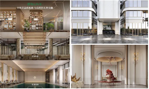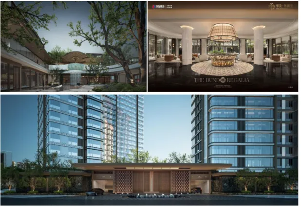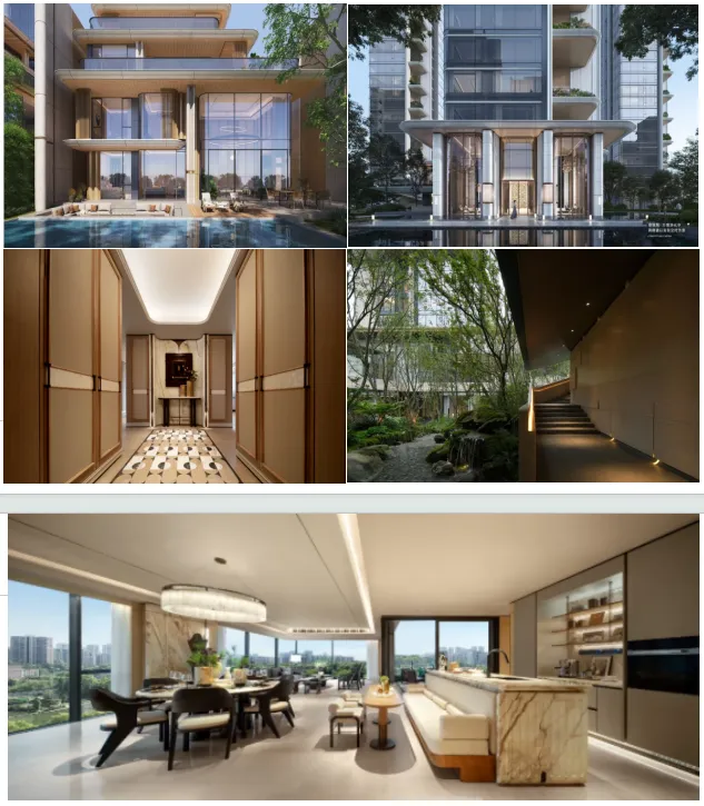 项目亮点:户型以 270°环幕江景为核心,全板楼布局实现户户无遮挡瞰江(如 199 平户型拥29.5米观江面宽),结合 3.55 米层高与独梯独户设计提升空间舒适度;创新“生机之环”地下空间通过四层通高森境谷庭、绿植瀑布将自然引入地库,形成艺术化归家动线;立面融合宋代《水图十二卷》长江意象,香槟色波浪铝板玻璃幕墙呼应江波纹理;双会所配置涵盖恒温泳池、私宴露台、室内高尔夫及赛事级篮球馆,延伸精英社交场景。