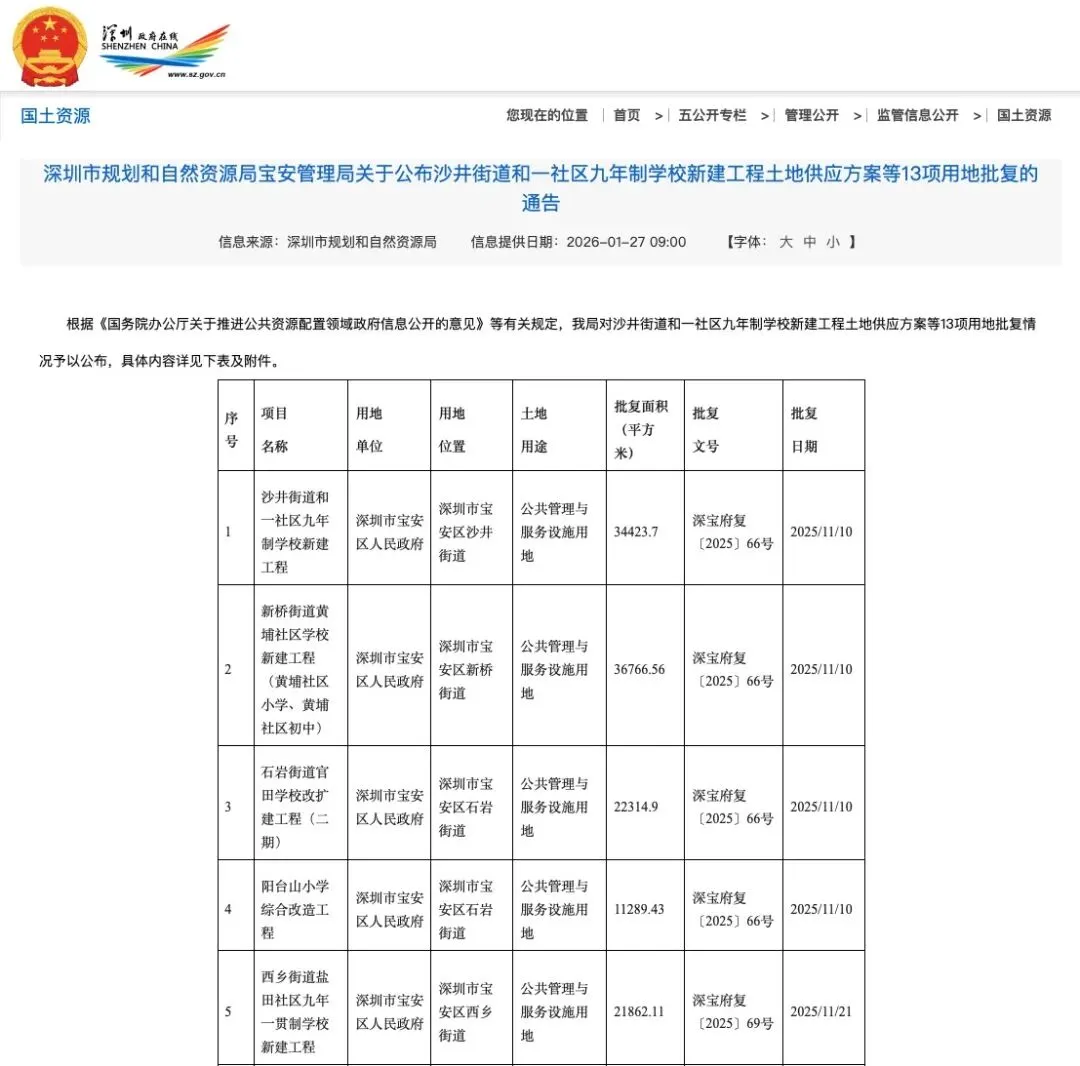 近日,深圳宝安区公布了公布沙井街道和一社区九年制学校新建工程土地供应方案等13项用地批复的通告,涉及教育、公园绿地、市政公用及轨道交通等多类型建设项目。