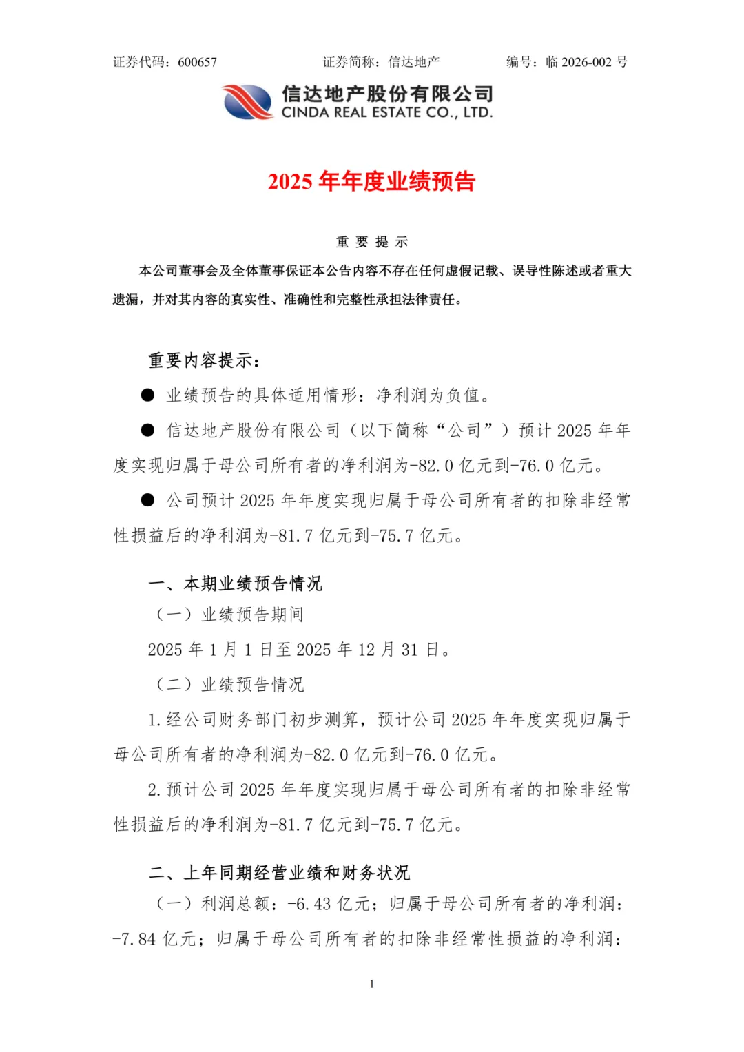 1月21日,信达地产公告称,预计2025年度归属于母公司所有者的净利润为-82.00亿元到-76.00亿元。上年同期为-7.84亿元。本期业绩出现亏损的主要原因如下:(一)本期房地产开发项目集中交付规模减少,营业收入和毛利率同比下降。(二)部分房地产开发项目及对外财务性投资存在减值迹象,公司结合市场情况,根据谨慎性原则计提相应减值准备。(来源:信达地产)