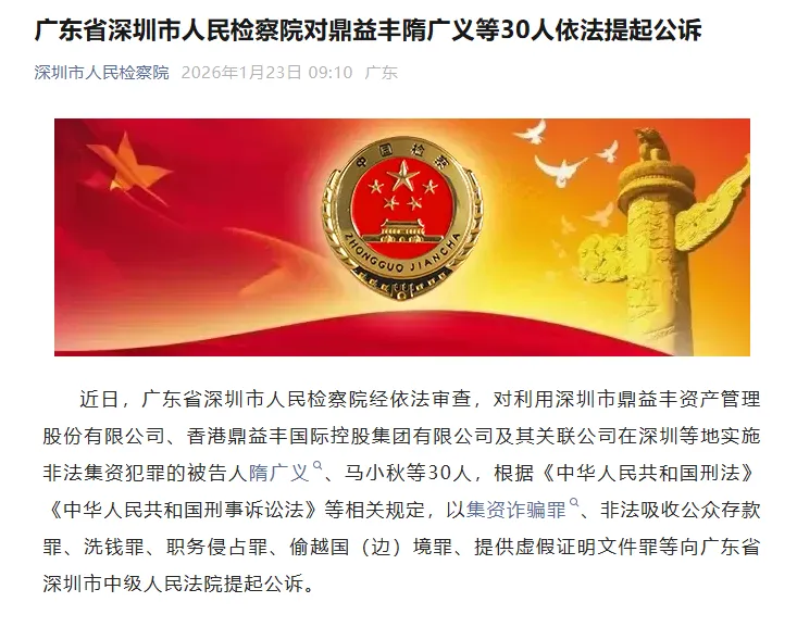 1月23日,广东省深圳市人民检察院发布公告称,近日对鼎益丰核心成员隋广义、马小秋等30人以集资诈骗罪、非法吸收公众存款罪等罪名依法提起公诉。广东省深圳市人民检察院公告称,近日经依法审查,对利用深圳市鼎益丰资产管理股份有限公司、香港鼎益丰国际控股集团有限公司及其关联公司在深圳等地从事非法集资犯罪的被告人隋广义、马小秋等30人,根据《中华人民共和国刑法》《中华人民共和国刑事诉讼法》等相关规定,以集资诈骗罪、非法吸收公众存款罪、洗钱罪、职务侵占罪、偷越国(边)境罪、提供虚假证明文件罪等向广东省深圳市中级人民法院提起公诉。福田区人民检察院也称,近日经依法审查,对利用深圳市鼎益丰资产管理股份有限公司、香港鼎益丰国际控股集团有限公司及其关联公司在深圳等地从事非法集资犯罪的被告人唐吉强、朱云雷等50人,根据《中华人民共和国刑法》《中华人民共和国刑事诉讼法》等相关规定,以非法吸收公众存款罪、帮助信息网络犯罪活动罪、非法利用信息网络罪等向广东省深圳市福田区人民法院提起公诉。