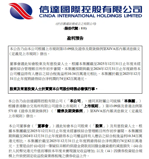 信达国际控股预计2025年净利润7400万港元至8200万港元